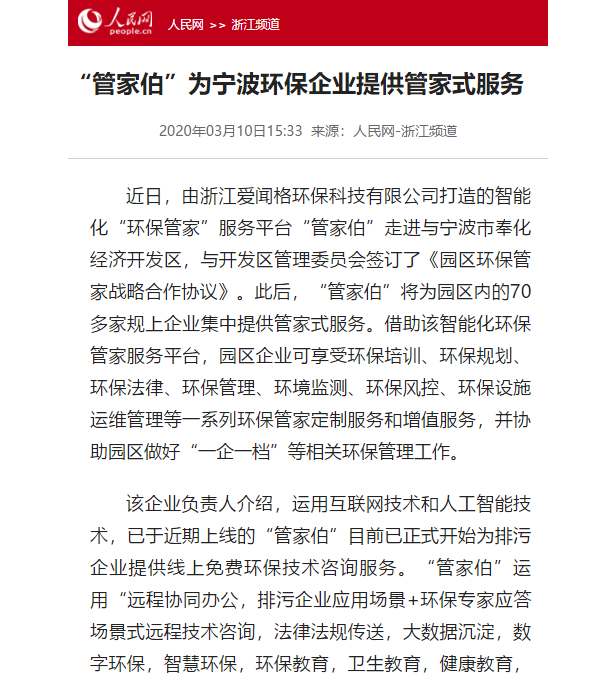 Recently, the intelligent "Environmental Stewardship" service platform "guanjiabo" built by Zhejiang irvinger Environmental Protection Technology Co., Ltd. entered Ningbo Fenghua Economic Development Zone and signed the "strategic cooperation agreement on environmental stewardship in the park" with the Development Zone Management Committee. Since then, "chamberlain" will provide Chamberlain services for more than 70 enterprises in the park. With the help of the intelligent environmental stewardship service platform, enterprises in the park can enjoy a series of customized services and value-added services for environmental stewardship, such as environmental protection training, environmental planning, environmental protection law, environmental management, environmental monitoring, environmental risk control, operation and maintenance management of environmental protection facilities, and help the Park to do a good job in "one enterprise, one file" and other related environmental management.