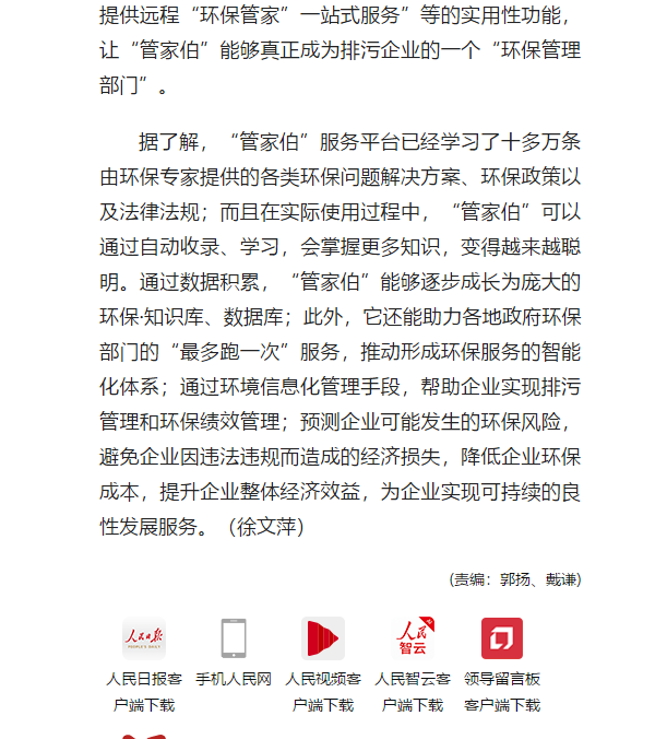 It is understood that the "chamberlain" service platform has learned more than 100000 environmental protection solutions, policies, laws and regulations provided by environmental protection experts; moreover, in the actual use process, "chamberlain" can acquire more knowledge and become more and more intelligent through automatic collection and learning. Through data accumulation, "chamberlain" can gradually grow into a huge environmental protection knowledge base and database; in addition, it can help the environmental protection departments of local governments to "run once at most" services, and promote the formation of an intelligent system of environmental protection services; through the environmental information management process, help enterprises to achieve pollution management and environmental performance management; predict the environmental protection that may occur in Enterprises Risk, to avoid the economic losses caused by the violation of laws and regulations, to reduce the cost of environmental protection, to improve the overall economic benefits of the enterprise, and to serve the sustainable and sound development of the enterprise. (Xu Wenping)